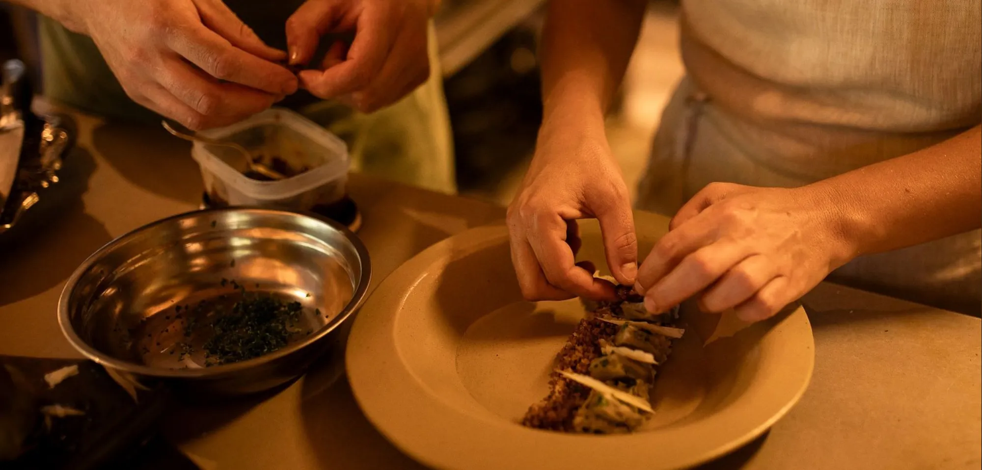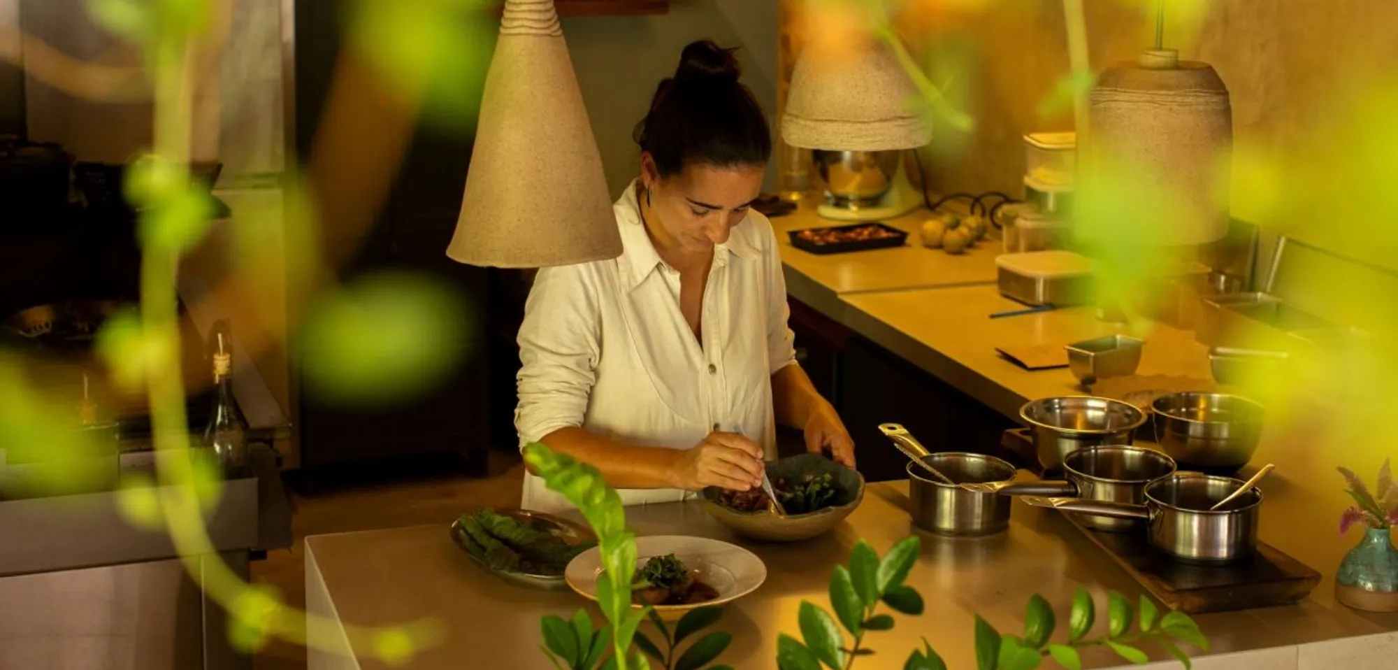 Chef Lydia Gonzalez prepara os pratos na cozinha aberta do Angá Ateliê Culinário, em Petrópolis.